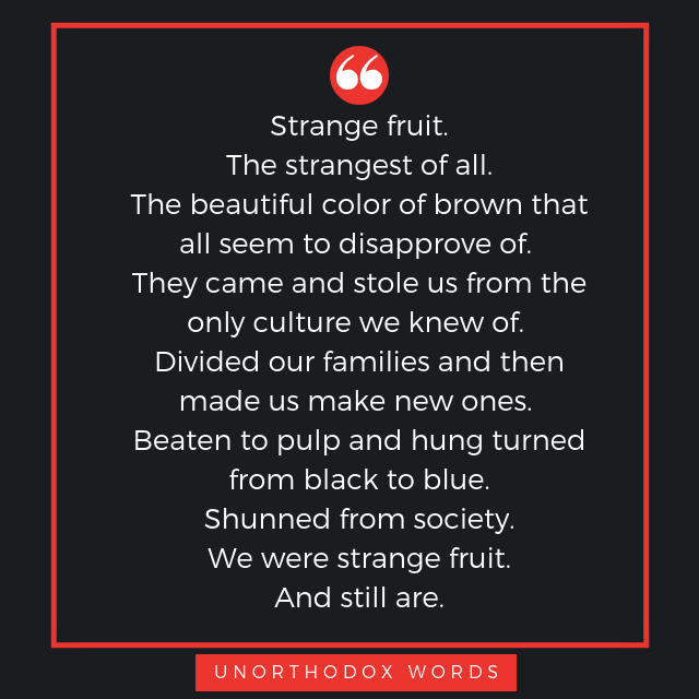 As promised in the previous post, here is an excerpt from the poetry book, Unorthodox Words. This book is about any and everything that I felt contributed to my depression. And not being accepted as a gay black woman was tough for me. I hurt and love like everybody else. I work hard and cry like everybody else. Being black does not define me. Being gay does not define me. But those are titles that other people automatically define me as, and that is something we all have to grow and work through. Someone will always throw a title on you. They will try and put you in a box if they do not understand you. They will throw their own insecurities and fears at you in forms of hatred, discrimination and prejudice. My advice to you today my gullies is this: love everything about yourself and be confident in the things that people are intimidated by. They hate you because they fear you. You are something they are not, and that bothers them. Black History Month is an amazing thing for people that are not a minority. I say that because people of color do not need a month to remember who we are. We are reminded everyday. But it is NEEDED for others to learn about our accomplishments, our achievements, and our mark in the world because it is not spoken or taught about enough in school. As the poem above says, our color of brown is disapproved of. Why? Because our color is powerful. It is magical. It resembles perseverance and strength. We are different and people hate different. Why do people want a tan? Why do people want lip fillers, butt injections, and curves? If they hate us so much, why do people love hip-hop culture and slang? We have done nothing for them to hate us. So the answer to me is they want to be us, but they can’t, so they try to belittle us, degrade us, and make us less than. That is not okay. But we will rise up and never be ashamed of who we are. I am finally okay with being strange. This poem is for anyone that feels like a strange fruit that is shunned from society. You might not be black, but might have something different about you that society just can’t seem to get down with.